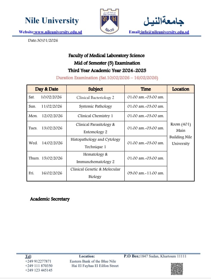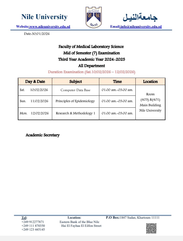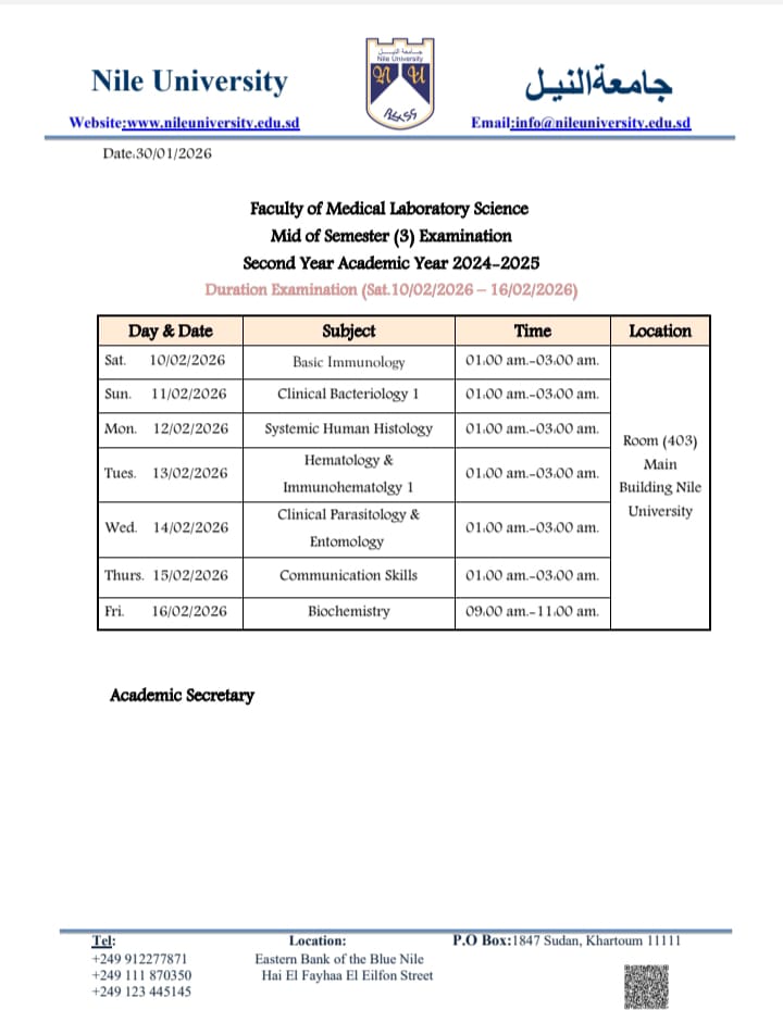 إعلان مهم جداول امتحانات منتصف الفصل الدراسي الثالث والخامس والسابع لطلاب كلية المختبرات الطبية