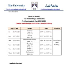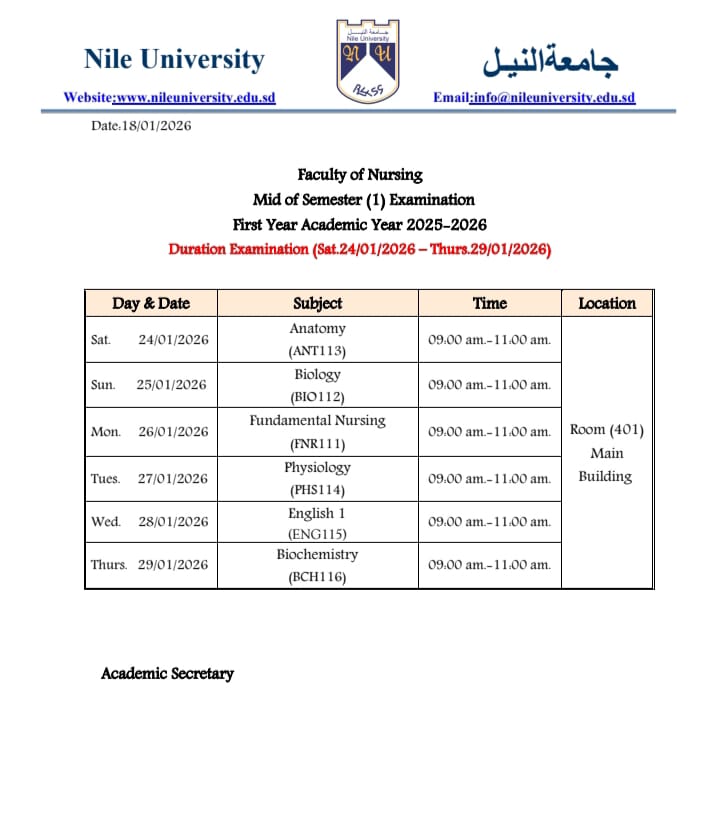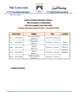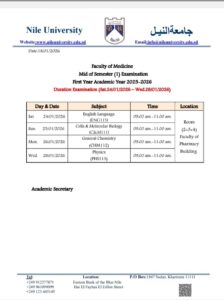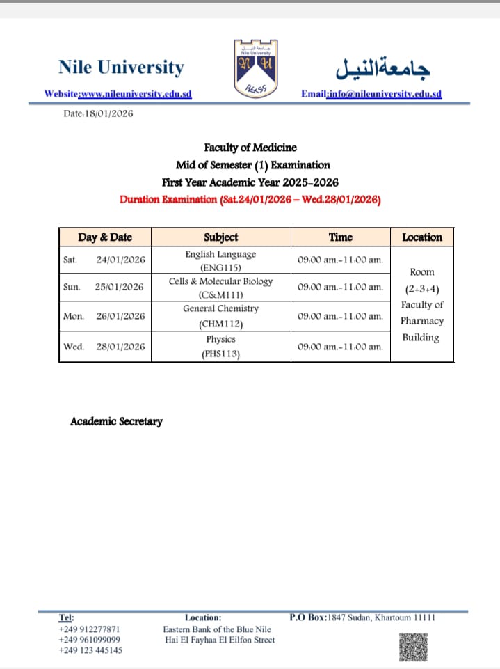 جداول إمتحانات منتصف الفصل الدراسي الاول لدفعه 2024- 2025كلية الطب والجراحة وكلية علوم التمريض وكلية المختبرات الطبية وذلك بمقر الجامعة الرئيسي بالخرطوم -شرق النيل